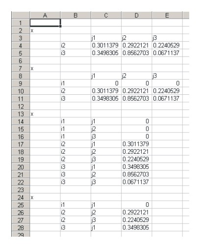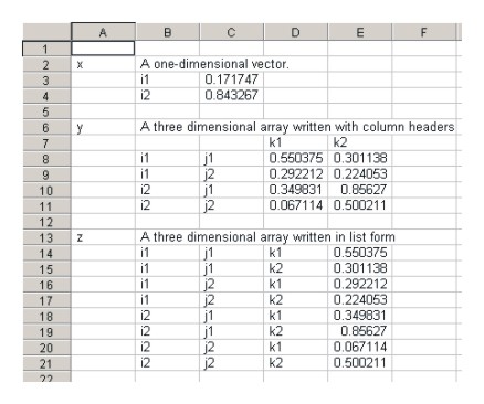set i /i1*i2/, j/j1*j2/, k/k1*k2/; parameter x(i) A one-dimensional vector. y(i,j,k) A three dimensional array written with column headers z(i,j,k) A three dimensional array written in list form; x(i) = uniform(0,1); y(i,j,k) = uniform(0,1); z(i,j,k) = y(i,j,k); file kout /ex2.csv/; put kout; $libinclude gams2csv i x $libinclude gams2csv i,j k y $libinclude gams2csv i,j,k zWhen the output file ex2.csv is loaded into a spreadsheet, it has the following layout: