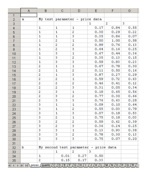 set i/1*3/; alias (i,j,k,l); parameter a(i,j,k,l) My test parameter - price data, b(i,j) My second test parameter - price data c(i) My third test parameter - quantity data d(i,j) My fourth test parameter - quantity data; a(i,j,k,l) = uniform(0,1); b(i,j) = uniform(0,1); c(i) = uniform(0,1); d(i,j) = uniform(0,1); * Create a separate CSV file for each worksheet that is to be * written into the XL workbook. Here we illustrate how the * GAMS scratch directory can be used so that the CSV files are * erased at the end of the GAMS run. * *gams.scrdir% represents the scratch directory (e.g. 225a) * .scr is a non-standard suffix for a CSV file which * is used so that GAMS will erase the file at * the end of the run. file kprc /%gams.scrdir%prices.scr/; * If the CSV file were to be retained at the end of the run, it could be * declared simply: * file kprc /prices.csv/; put kprc; $libinclude gams2csv i,j,k l a $libinclude gams2csv i j b * Create a second worksheet for inclusion in the workbook: file kqty /%gams.scrdir%quants.scr/; put kqty; $libinclude gams2csv i c $libinclude gams2csv d $libinclude gams2csv i,j d * Need to close both CSV files before writing the workbook: putclose kprc; putclose kqty; * Now call XLWRITE: execute 'xlwrite %gams.scrdir%prices.scr %gams.scrdir%quants.scr ex5.xls';
