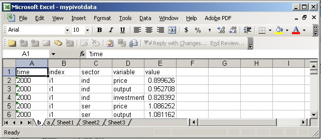 $title Illustrate How to Use BATINCLUDE File pivotdata.gms * Generate lots of multidimensional output: set t /2000*2100/ s /ind, ser, agr/ i /i1,i4/, k /price, output, investment/; * In this example we have two arrays of data: a and b, * both randomly assigned. parameter a(t,s,k), b(t,i,s,k), c(t,s); a(t,s,k) = exp(0.02*(ord(t)-1)) * uniform(0.8,1.2); b(t,i,s,k) = exp(0.01*(ord(t)-1)) * uniform(0.8,1.2); c(t,s) = exp(0.01*(ord(t)-1)) * uniform(0.5,1.5); * Define the name of the workbook to be generated: $setglobal workbook mypivotdata * Optionally delete the workbook if you want to * have a fresh start: $if exist mypivotdata.xls $call 'rm mypivotdata.xls' * Dump out the data along with column headers -- * identifiers with which to label each colum of data. * The column with numeric values is always labelled "value". * You may wish to use set IDs as column headings: $batinclude pivotdata a t s k * Or you may wish to use more descriptive names: $batinclude pivotdata b time index sector variable * If you fail to provide column headings, pivotdata.gms * will not complain, but you will need to be sure you have entered * column headings in your workbook: $batinclude pivotdata c