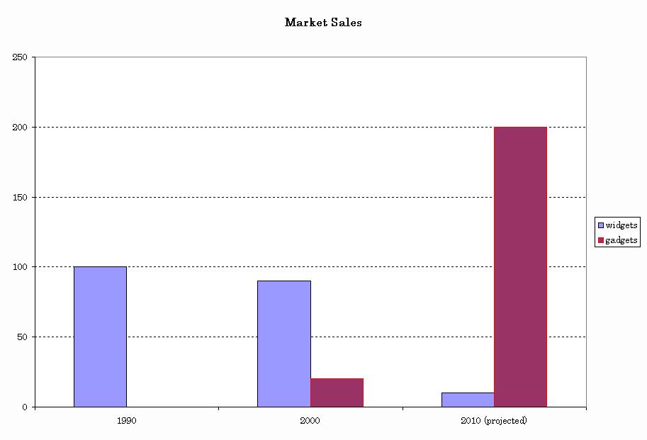 $title Example 2: Plot a Histogram set t Time periods /1990,2000,2010/ l(t) Labels /1990,2000,2010 2010 (projected) /, p Products /widgets, gadgets/ table sales(t,p) Market Sales widgets gadgets 1990 100 0 2000 90 20 2010 10 200; * Specify domain, labels and series all explicitly: $set domain t $set labels l $set series p * Request a clustered column chart: $set charttype 51 $libinclude xlchart sales
